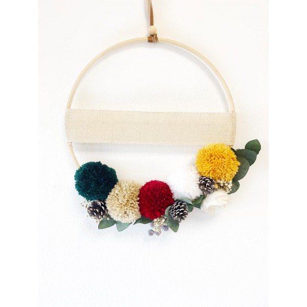 El bastidor está formado por un aro de madera, con una rafia, pompones de lana hechos a mano artesanalmente, flores, piñas naturales y eucalipto preservado. Lo recibirás en casa con un packaging espectacular.