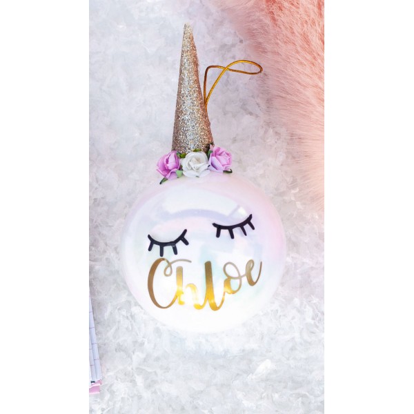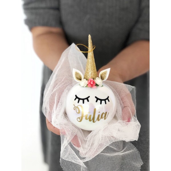 Divertida bola de Navidad con forma de unicornio personalizable con el noimbre que quieras. Puedes escribir el nombre en la pestaña de más abajo "personalización del producto".