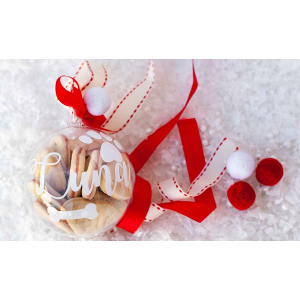 Divertida bola de Navidad decorada a mano con vinilo adhesivo y rellena de galletitas para perros con sabor a vainilla.