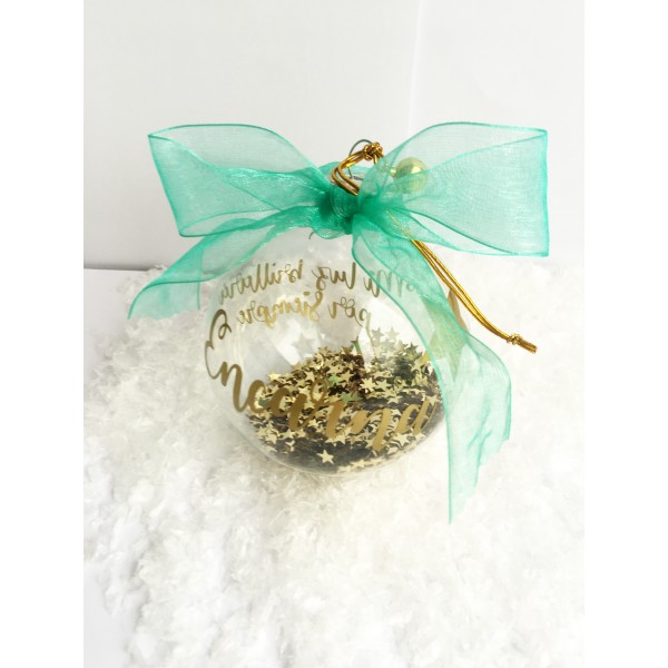 Regala una original bola de Navidad personalizada con una palabra por la parte delantera y un texto por detrás. Además le añadimos un mensaje en papel, enrollado y atado con cordón y dentro de la bola.