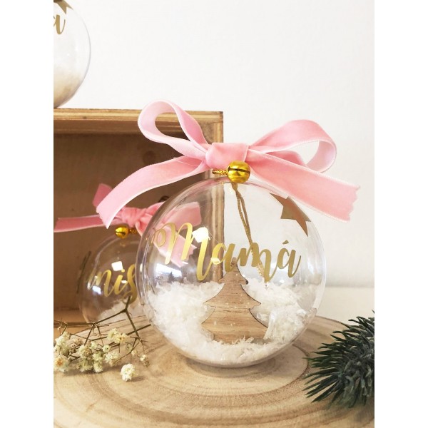 Esta Bola de Navidad con Abeto de Madera es de plástico, va rellena de nieve artificial y dentro tiene pegado un arbolito de madera. Puedes elegir el color del vinilo y el color del lazo en las pestañas de arriba al lado del precio.