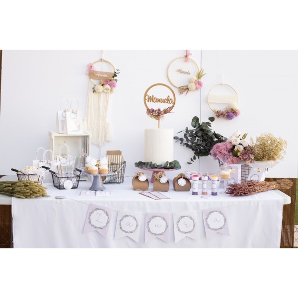 • Con esta modalidad recibirás una caja con tu fiesta preparad: tan sólo tienes que elegir en el desplegable los elementos que quieres y las cantidades que quieres de cada uno de ellos. Te llegará ya listo y con el menaje quecorresponda en cada caso: por ejemplo, una botellita con etiqueta te llegará una etiqueta con su etiqueta ya puesta. Una guirnalda personalizada te llegará una guirnalda ya montada con cordón y pinzas a los lados.