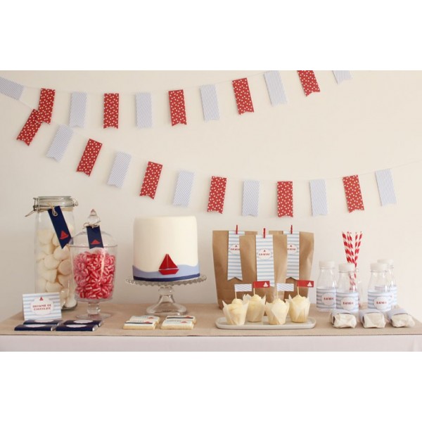 Decora tu mesa dulce con este precioso kit de fiesta marinero en el que se combinan los azules con el rojo y el blanco de forma genial para que este clásico quede de lo más sencillo y elegante.