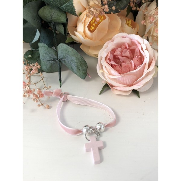 La pulsera hecha artesanalmente en nuestro taller está formada por una cruz de madera pintada en color rosa o al natural (color madera), va decorada con adornos metálicos color plata, y cinta de terciopelo. El cierre corredizo se ajusta a todo tipo de muñeca.