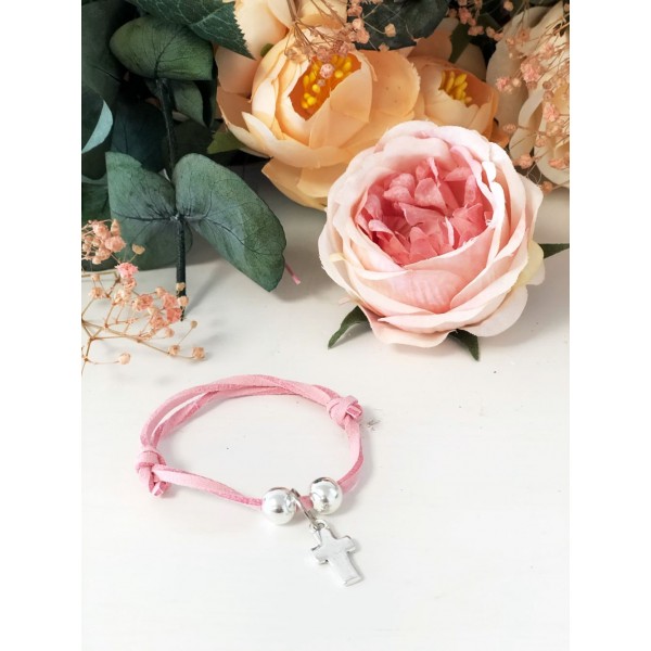 La pulsera hecha artesanalmente en nuestro taller está formada por una cruz metálica plateada, va decorada con adornos metálicos color plata, y cinta de antelina. El cierre corredizo se ajusta a todo tipo de muñeca.