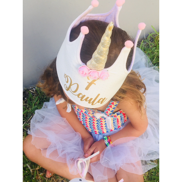 Fabricada en tela color crema exterior y rosa en el interior, cuerno de tela metalizada y flores. Personalizada con vinilo (nombrey edad). Te la hacemos de los colores que quieras y con el nombre en el color que quieras.
