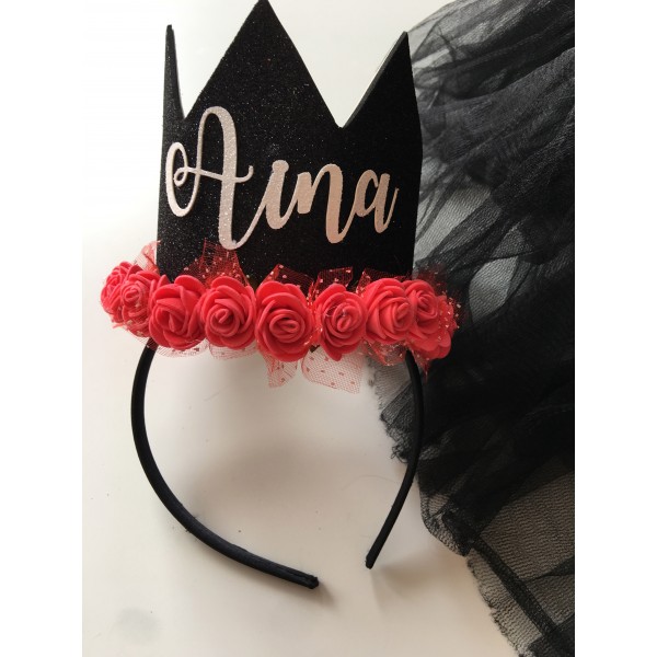 Puedes elegir el color de la corona, el color del nombre y del número, del interior de la corona y de la diadema. Te la personalizamos completamente.