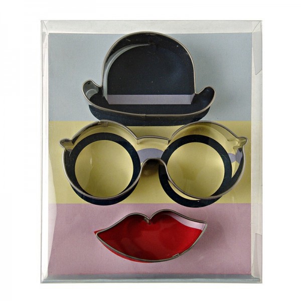 Set de 3 cortadores de galletas con forma de sombrero, gafas y labios. Incluye plantilla.