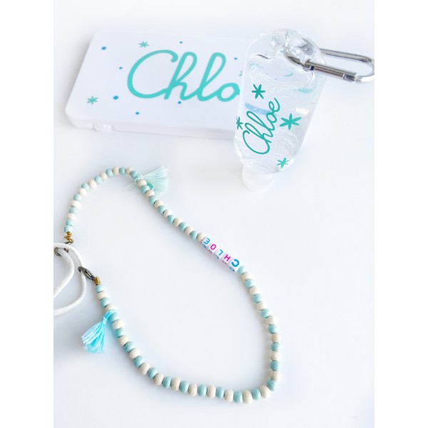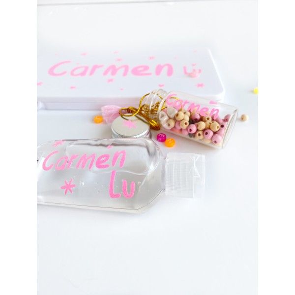 El pack contiene: un bote personalizado cuelgamascarilla "hazlo tú mismo" (no llega montado, es para que lo haga el niño o niña), un bote gel 50 ml personalizado tipo llavero y una caja personalizada para guardar las mascarillas de repuesto nuevas.