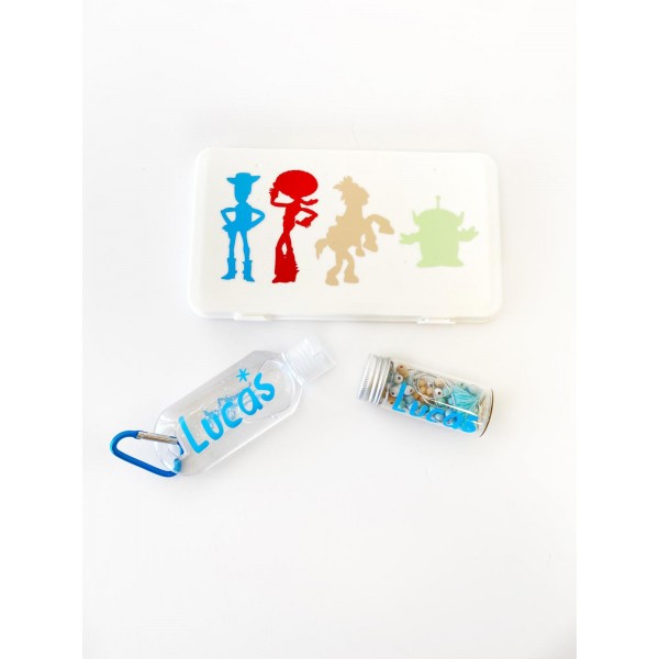 Pack de cuelgamascarilla, gel hidroalcohólico y cajita para mascarilla todo personalizado y con la temática de Toy Story.