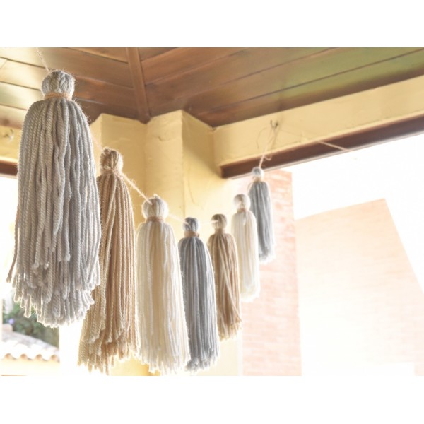 La guirnalda incluye 8 tassels de lana de 15 cm de largo cada una. Colores beige, camel y gris. Puedes personalizar tu guirnalda en el apartado de más abajo "personalización del producto".