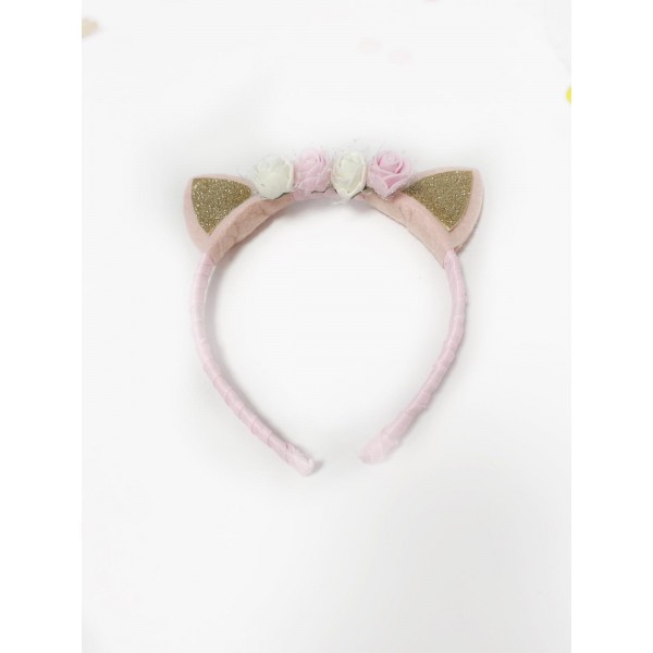 Fabricada artesanalmente, esta diadema está forrada con lazo y las orejas son de fieltro y gomaeva, al igual que las flores.