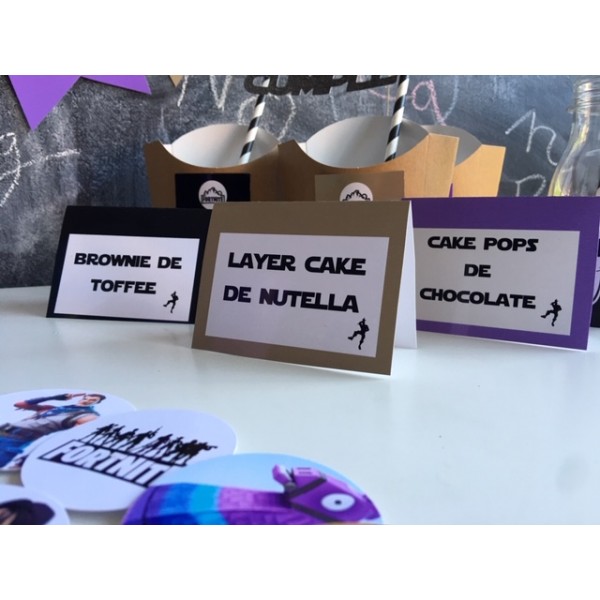 Con estos cartelitos podrás indicar a tus invitados la comida que has preparado. Decorados con la temática Fornite. Elige el texto de tus cartelitos. Puedes indicarlo en la pestaña de más abajo "personalización del producto". No olvides de pulsar en GUARDAR a la derecha.