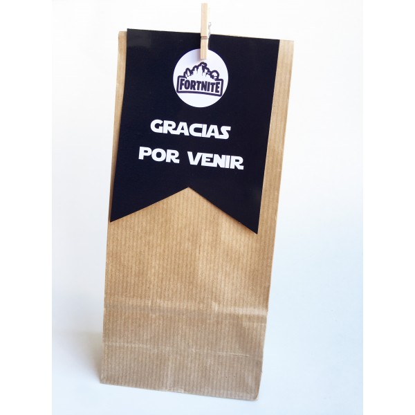Bolsita de papel para chuches con etiqueta de la temática Fornite. El precio incluye una bolsita con etiqueta y pinza. Montaje incluido.