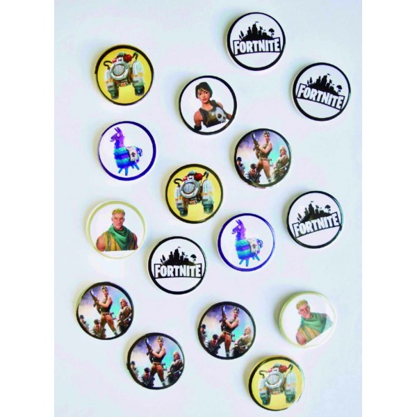 chapas con alfiler temática Fortnite. Sorporende a tus invitados con este detallito de la temática que más te gusta.