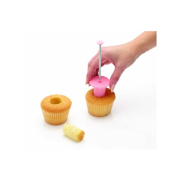 Descorazonador con expulsor que permite vaciar fácilmente cupcakes.