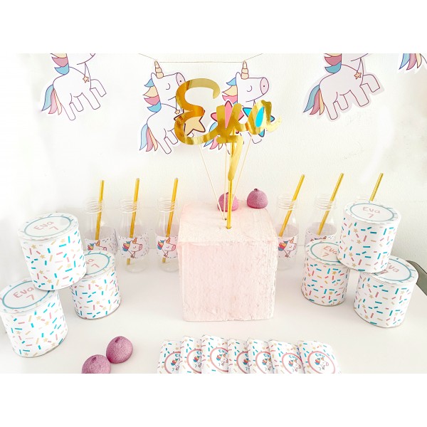 La guirnalda que se incluye es de 6 unicornios, no va personalizada.