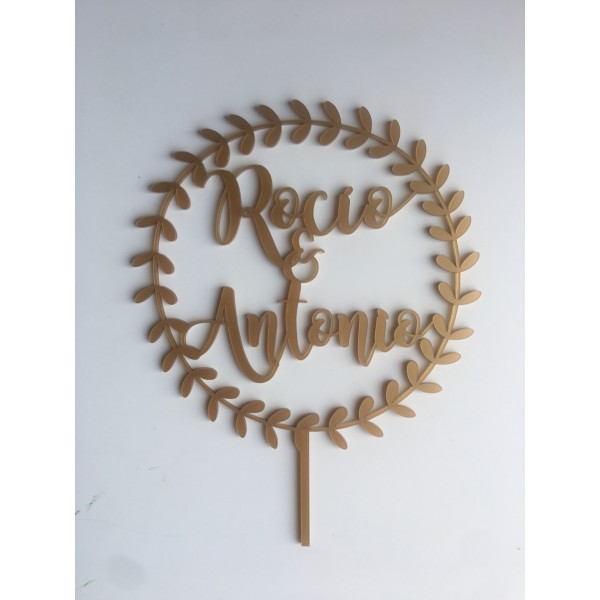 Decora tu tarta con un precioso topper Laurel fabricado en metacrilato dorado opaco.