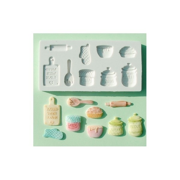 Molde de silicona con motivos de cocina. Ideal para fondant, pasta de goma, mazapán, chocolate...
