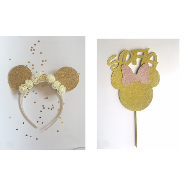 Precioso pack de Topper personalizado con el nombre que quieras y diadema de flores Minnie a juego.