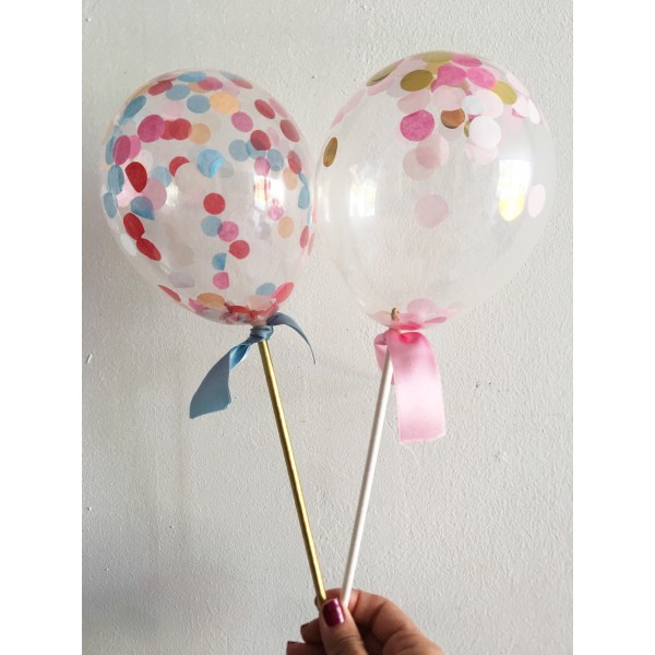 Decora tu tarta con estos preciosos toppers con globo 11 cm color ntransparente con confetti.