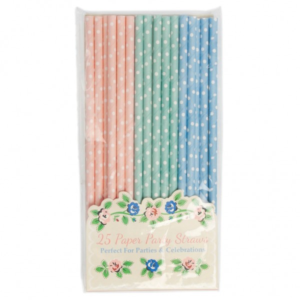 Pack de 25 pajitas en tres tonos pastel: rosa, verde y azul con topos blancos.