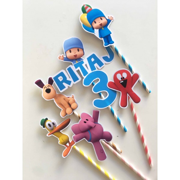 El kit contiene un nombre personalizado con la figura de Pocoyó, un número y 4 personajes indiciduales con pajitas de papel y dos figuras a elegir. Puedes indicar el nombre y la edad en la pestaña de más abajo personalización de producto.