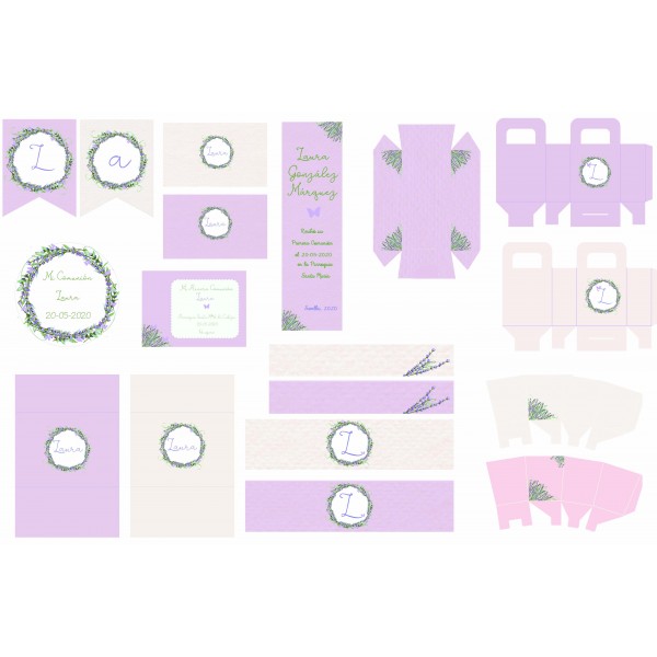 Preciosísima papelería diseñada con Lavanda, en tonos malva, vainilla y olivo.