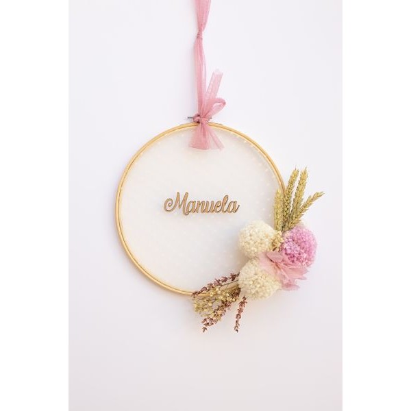 Precioso bastidor decorado a mano con pompones y flores preservadas y de tela. Personalizado con el nombre en madera. Tela plumeti.