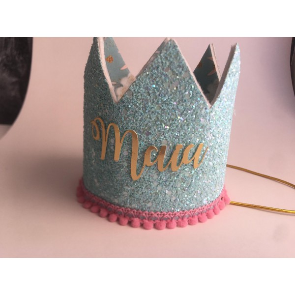Preciosa corona fabricada en tela purpurina con el interior de fieltro. Reforzada en el interior.