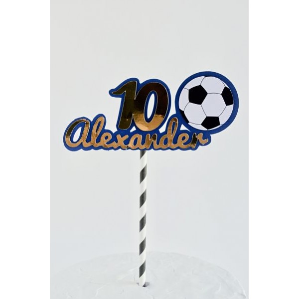 Este topper para tarta está fabricado en cartulina de color azul y dorada metalizada. Incluye accesorio de balón de fútbol y pajita de papel.