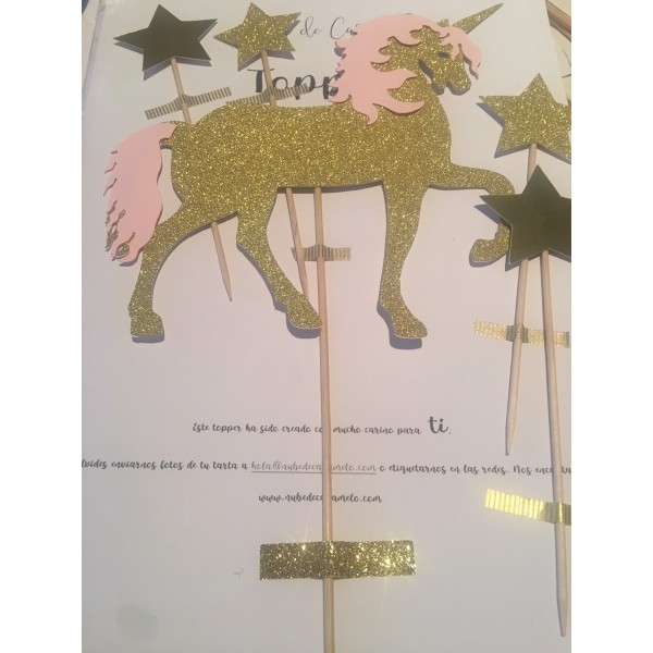 Decora tu tarta con un precioso topper dorado purpurina de unicornio con estrellas.