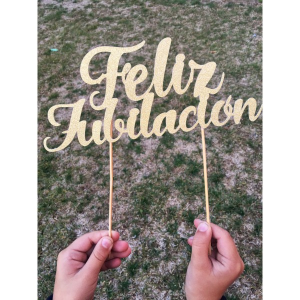 Decora tu tarta con este precioso topper Feliz Jubilación dorado mate.