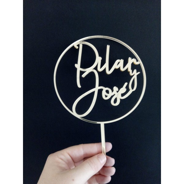 Precioso topper de boda fabricado en metacrilato dorado espejo.