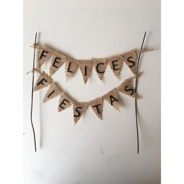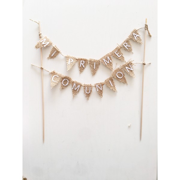 Decora tu tarta con este precioso topper fabricado en tela arpillería con letras en cartulina y palitos.
