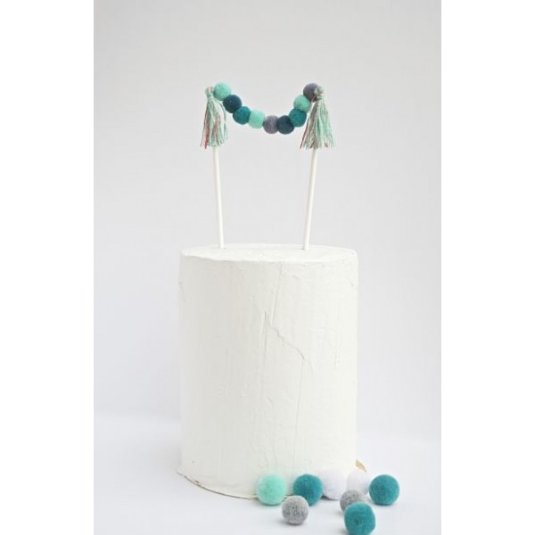 ¿Quieres darle un toque diferente a tus tartas? Mira esta preciosa guirnalda hecha a mano con pompones de lana en colores degradados menta y gris, acompañada de tassels de hilo de algodón.