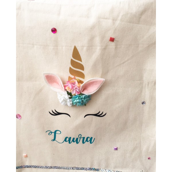 - Una bolsa de tela de algodón tamaño 38 * 42 cm. La bolsa se incluye personalizada con vinilo textil: cuerno del unicornio, pestañas y nombre de la niña. Podrás indicar el nombre y el color del nombre en la pestaña de más abajo "personalización del producto" y GUARDAR o en los comentarios del pedido. Sólo un nombre por bolsa. Si no nos indicas color entenderemos que podremos usar uno aleatorio dentro de los disponibles.