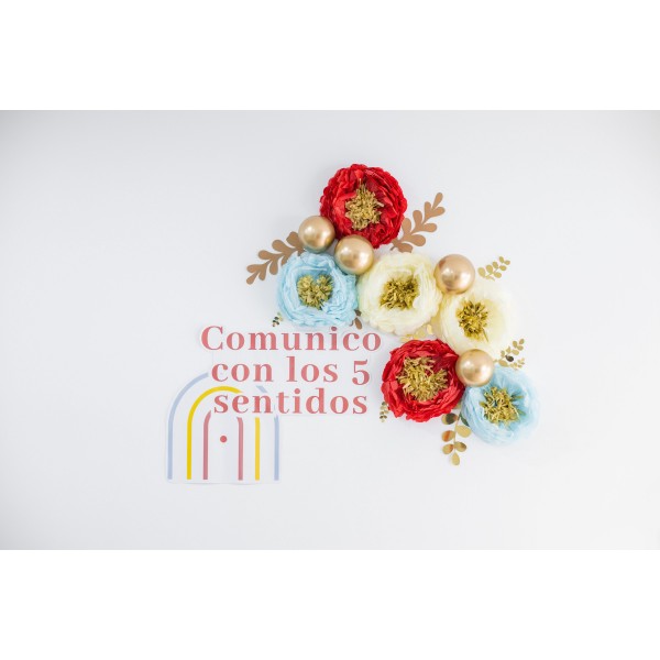 El backdrop consta de: seis flores de papel de seda de 30cm de colores a elegir, con ramas en cartulina dorada y cuatro globos dorados Chrome metalizados de alta calidad de 13cm.