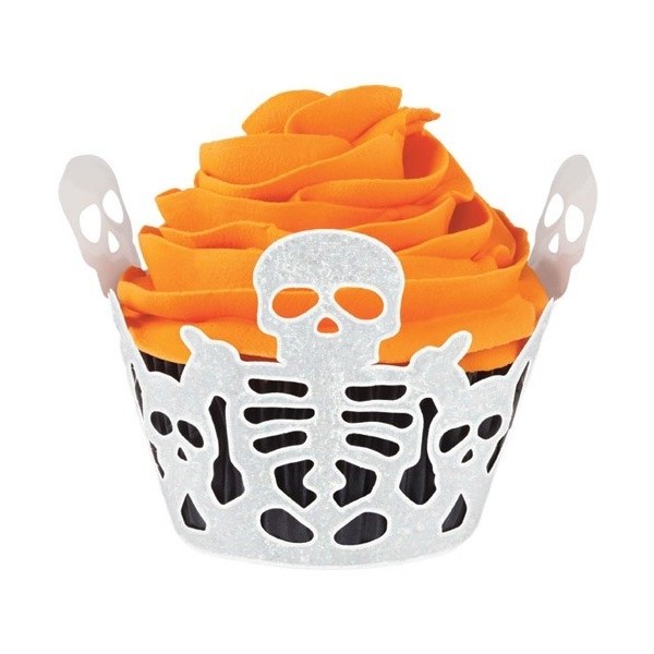 Pack de 18 wrappers de ESQUELETOS, ideal para decorar tus cupcakes en Halloween.